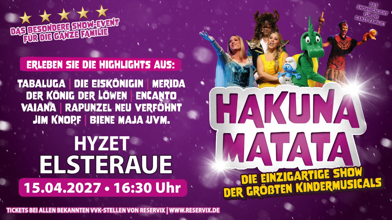 Die Kindermusical-Gala „Hakuna Matata“ verspricht eine zauberhafte Reise durch die bunte Welt der Musicals, den bekanntesten Disney-Filmen, sowie den beliebtesten Kinderfilmen-und Serien und berührt die Herzen aller Generationen. Mit den großen Kindheits-Helden und mitreißenden Liedern zum Mitsingen und Tanzen wird diese Gala zu einem unvergesslichen Erlebnis für die ganze Familie.