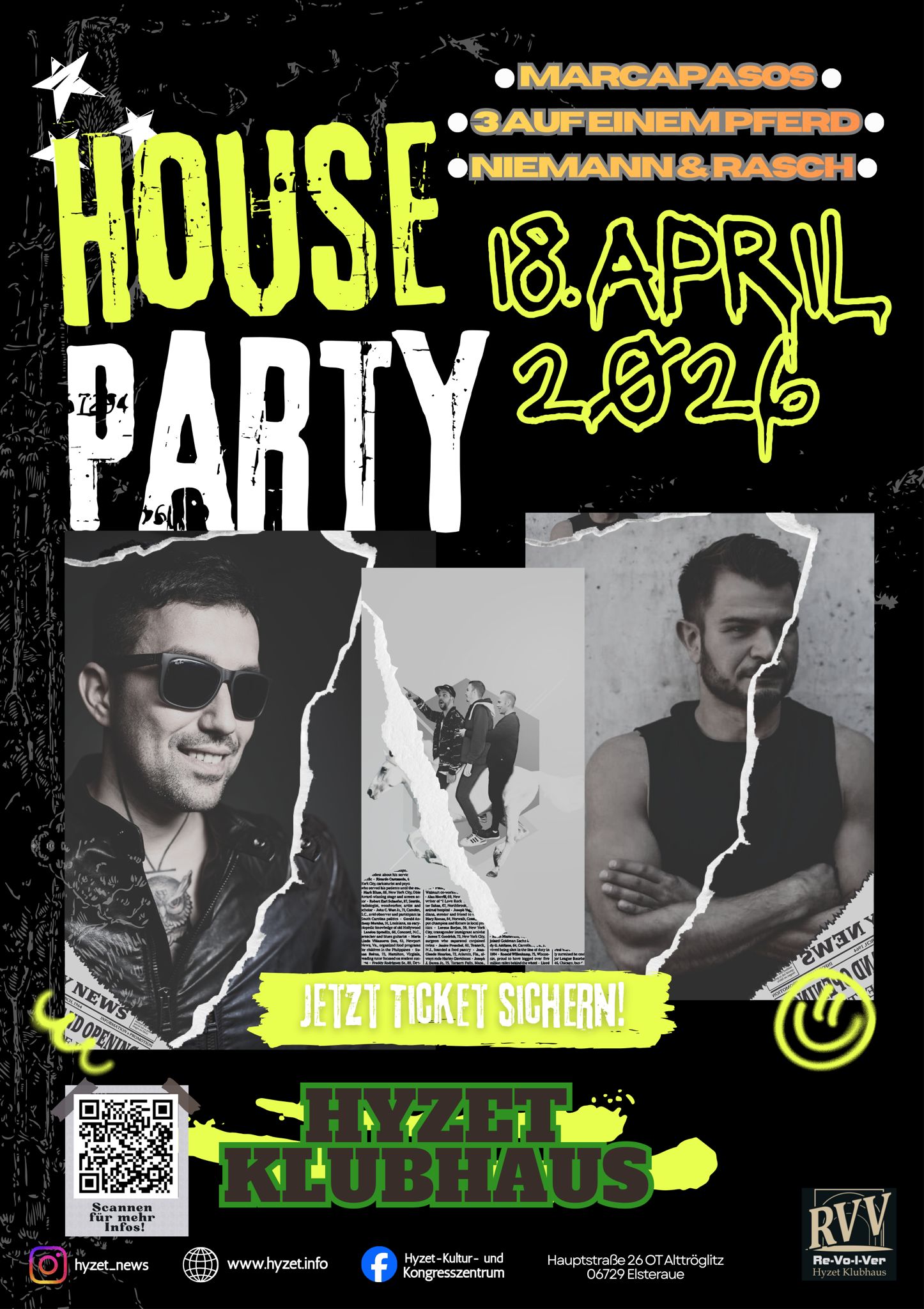 Es ist soweit: Unsere legendäre Hausparty steht vor der Tür! Tauche ein in eine Nacht voller Musik, Lachen und unerwarteter Momente. Stell dir vor: Marcapasos , 3auf einem Pferd, Nieman und Rasch – eine skurrile Truppe, die garantiert für Chaos und gute Laune sorgt. Ob beim Tanzen, Quatschen oder einfach beim Abhängen mit Freunden – hier ist alles erlaubt und nichts muss ernst genommen werden. Bring deine Freunde mit, gute Laune im Gepäck, und sei dabei, wenn wir gemeinsam eine unvergessliche Nacht erleben!